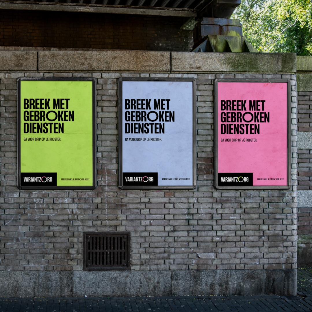 De meeste zorgorganisaties richten zich op de 'het is een roeping' en 'het geeft zoveel voldoening' kant van de baan. Dit bracht ons op een nieuwe propositie en merkidentiteit voor VariantZorg waar we juist een ander verhaal vertellen dan de concurrentie. Op krachtige, uitgesproken en energieke wijze.